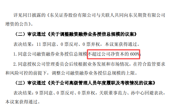 根据公告,东吴证券将融资融券业务授信总规模上限提升至不超过公司净资本的600%,即净资本的6倍。此外,东吴证券还计划与关联人共同向旗下核心子公司——东吴期货增资5亿元,其中,东吴证券将出资4.033亿元。