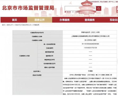 今年2月,北京市朝阳区市场监督管理局发布了一则行政处罚公告。林清轩关联公司因在广告宣传中使用“山茶花抗老修护”相关字样,涉嫌虚假广告,被罚款2.1万元。