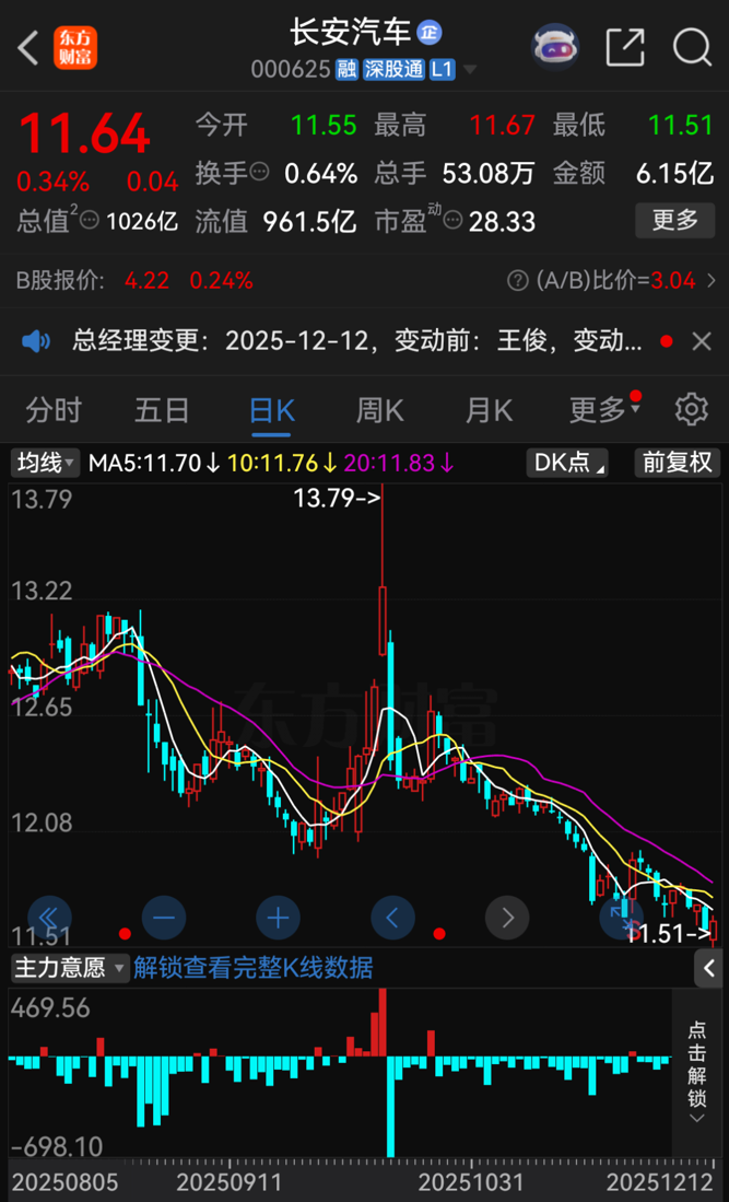 截至12月12日收盘,长安汽车A股股价报11.64元/股,总市值为1026亿元。