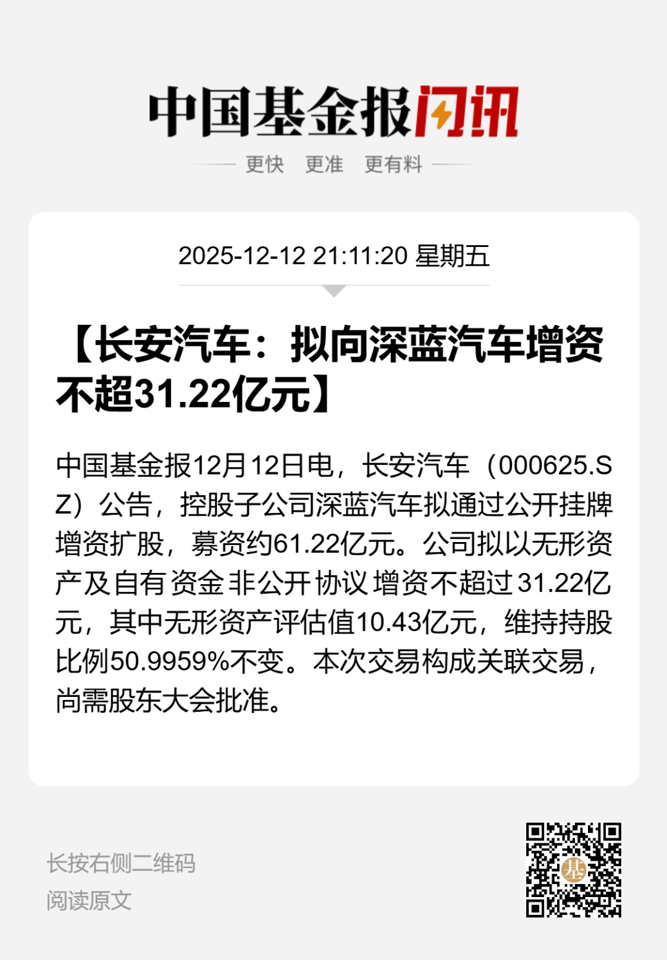 长安汽车公告称,公司根据征集到的合格投资人实际出资金额,以及最终增资价格调整出资金额,保障本次增资后持有深蓝汽车的股权比例维持不变,达50.9959%。
